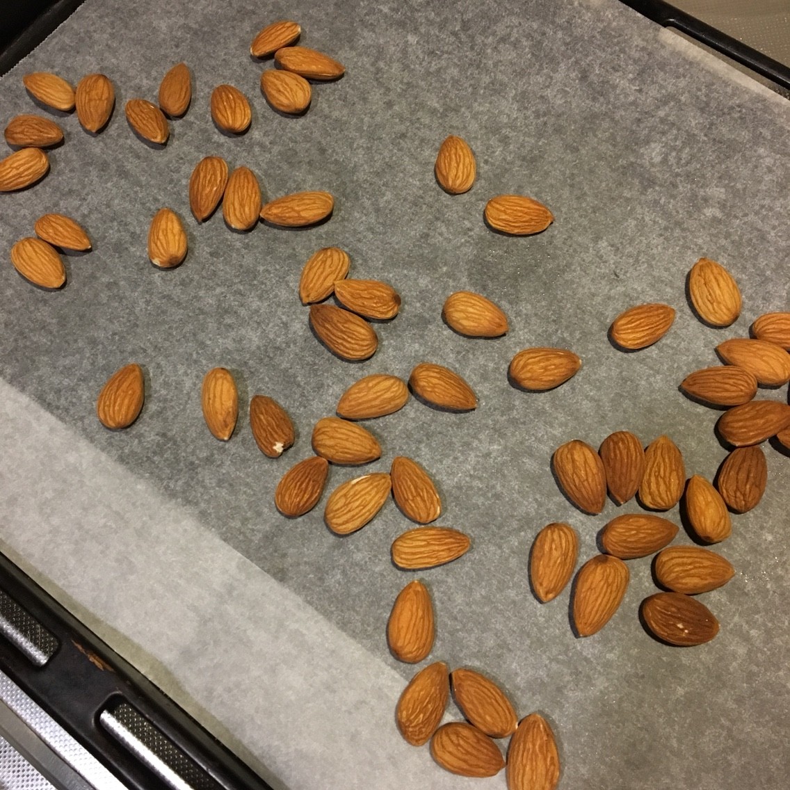 まずはアーモンド60gを160度のオーブンで10分ローストし、横半分にカットします。