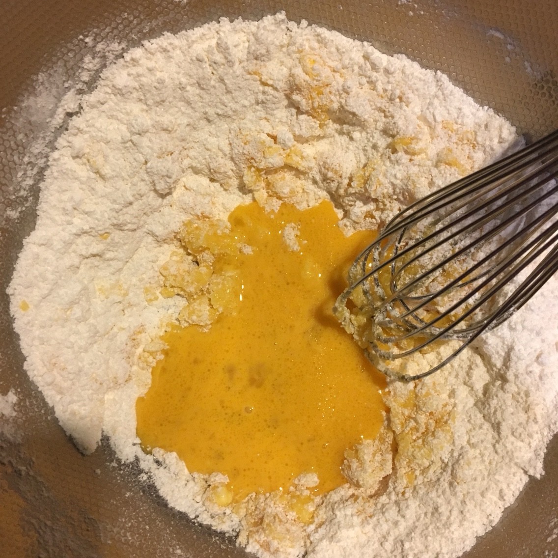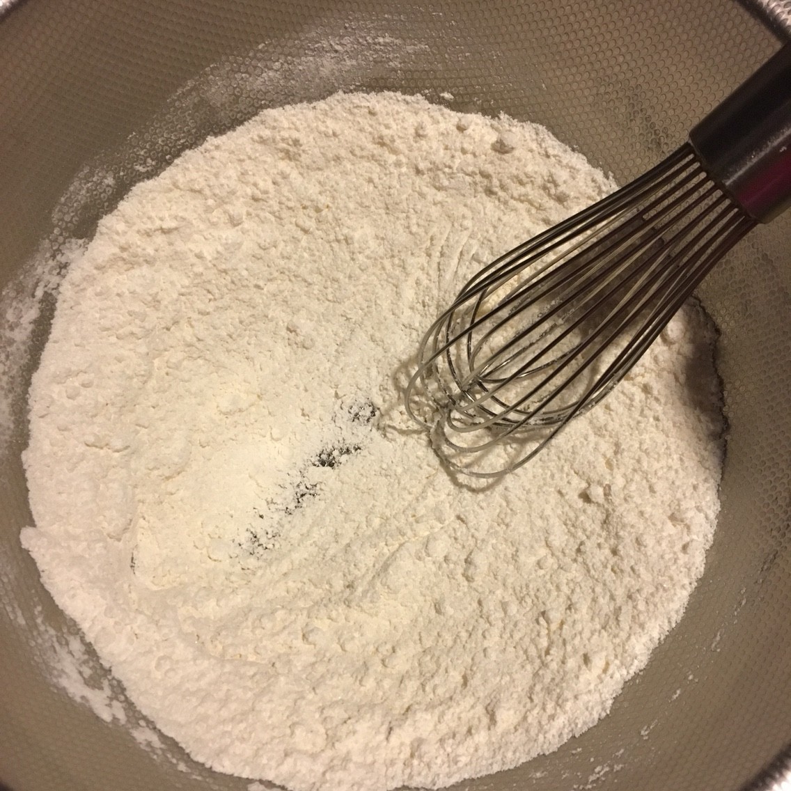 次にボウルに粉類を入れ、ホイッパーでよく混ぜます。