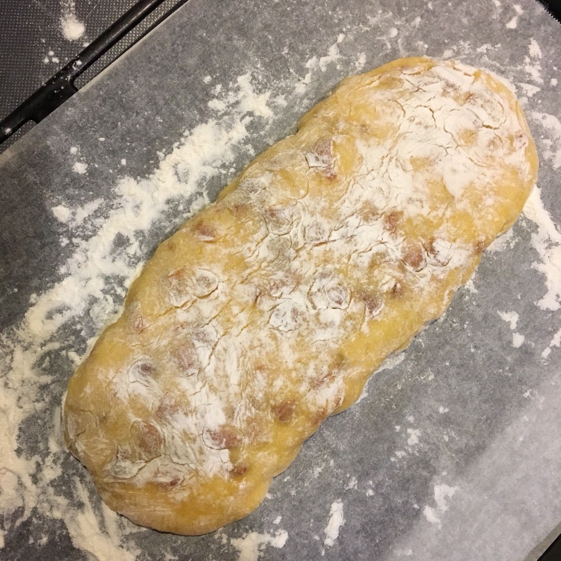 オーブンシートに小麦粉を振り、手にも小麦粉を付けながら生地を置き、長さ20cm×幅7cm×厚み1.5cmの大きさに成形後、170度のオーブンで20分焼きます。