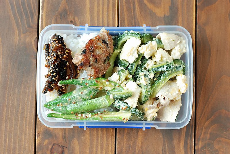 8月の終わりくらいに作った弁当なので、ゴーヤとオクラがモリモリです