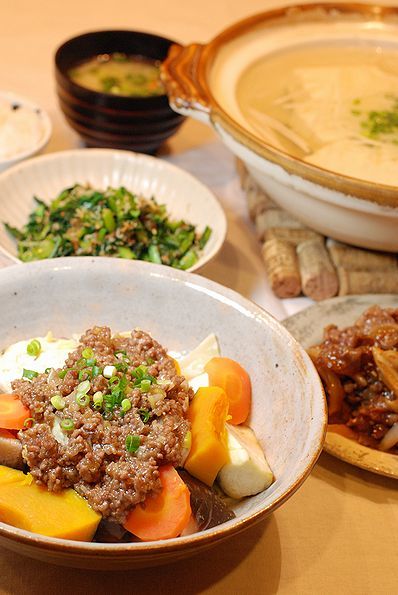 蒸し野菜のひき肉あんメインの豆腐や小松菜を使ったお料理でした~♬
