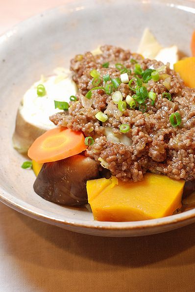 カボチャやキャベツ、椎茸、人参を甘辛ひき肉餡で頂きました~