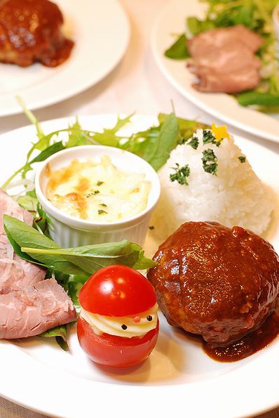 盛り付けたのは、煮込みハンバーグとローストビーフ、ミニグラタンとツリー風ご飯、ベビーリーフ。