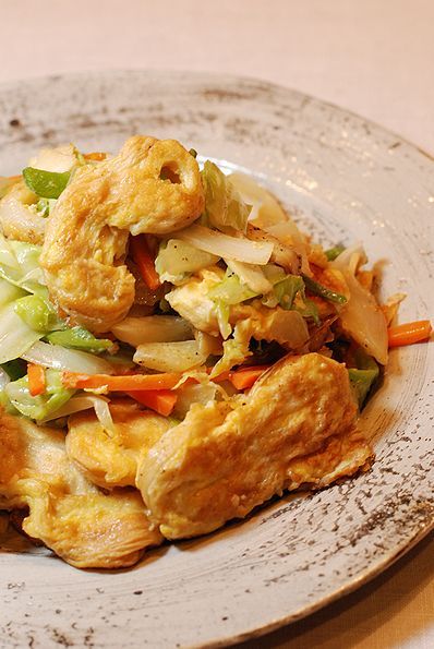 車麩を卵液に浸したものをお肉の代わりに入れてます。