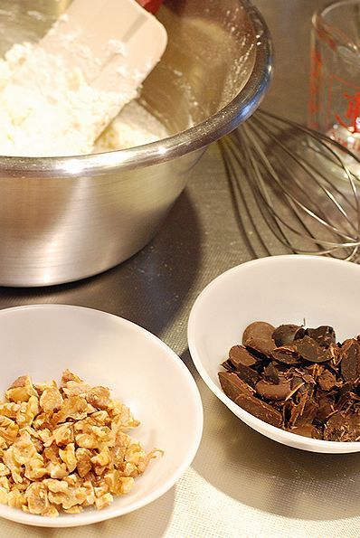 まだ粉が残った状態で刻んだクルミと板チョコを加える