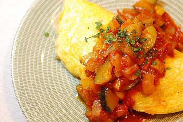 ソースはトマト一玉、好みの夏野菜、ケチャップ、コンソメ、水