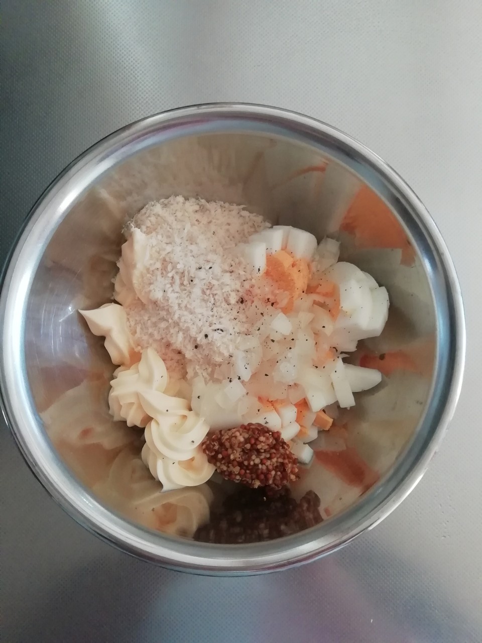 卵はみじん切りにする。玉ねぎはみじん切りにして耐熱容器に入れレンジ600wで20秒加熱する