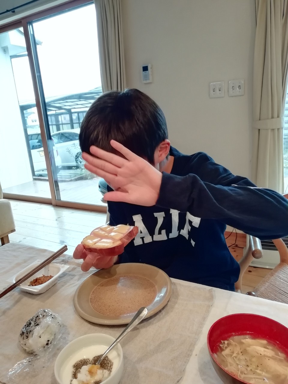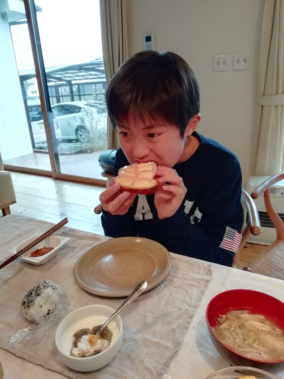 チーズトーストは、おばあちゃんからお土産に頂いた高級チーズを切ってパンに乗せ焼きました~