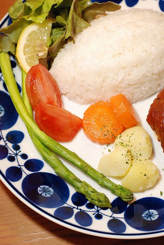 付け合わせはトースターで焼いたアスパラと小吹芋、人参グラッセとサラダです