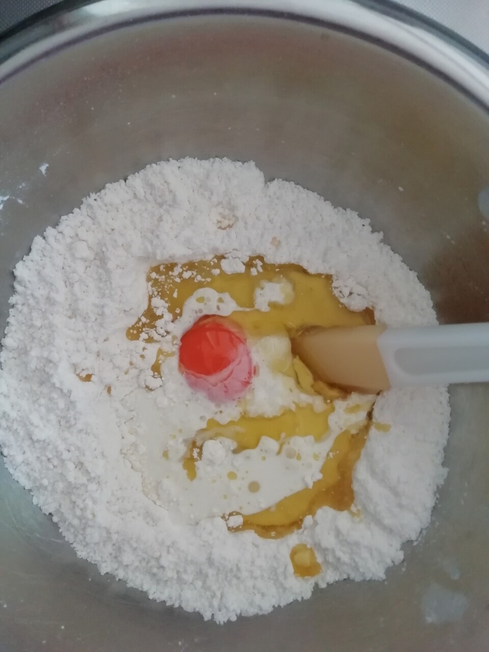 卵黄、生クリーム、オリーブオイルを加えゴムベラでサックリ混ぜる
