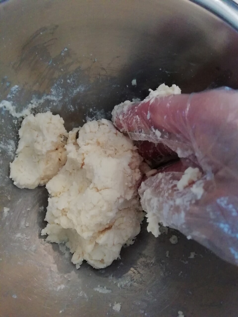 冷凍ブルーベリーを加え手で厚み1.5cmほどの円形にまとめスケッパーで放射線状に6等分にカットする