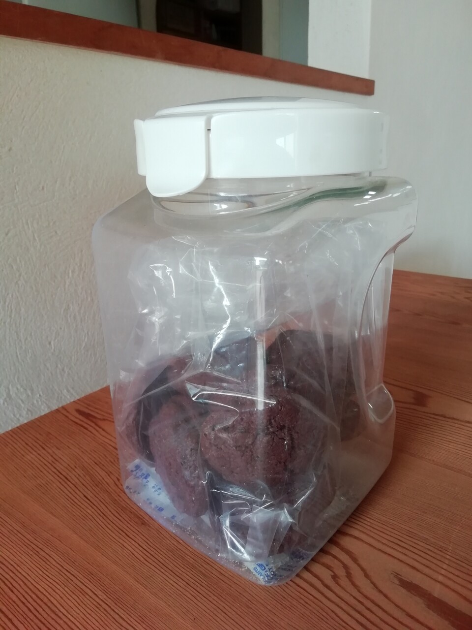私は容器の中に厚手のビニールを入れ、その中にお菓子を入れてます。