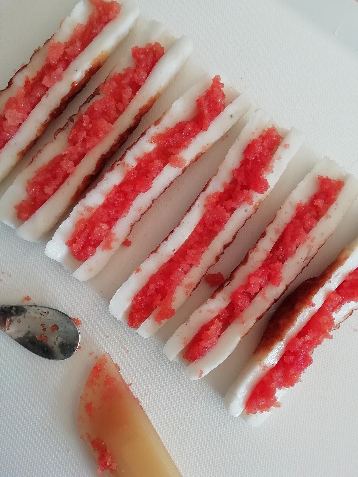 明太子をほぐしてちくわの溝にスプーンやヘラを使って入れる