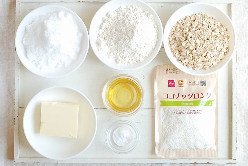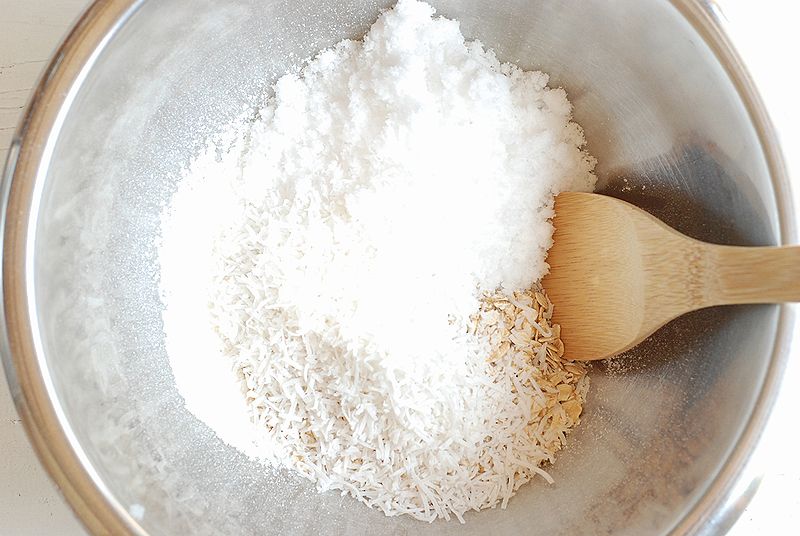 ボウルにオートミールとココナッツロング、砂糖を入れよく混ぜる