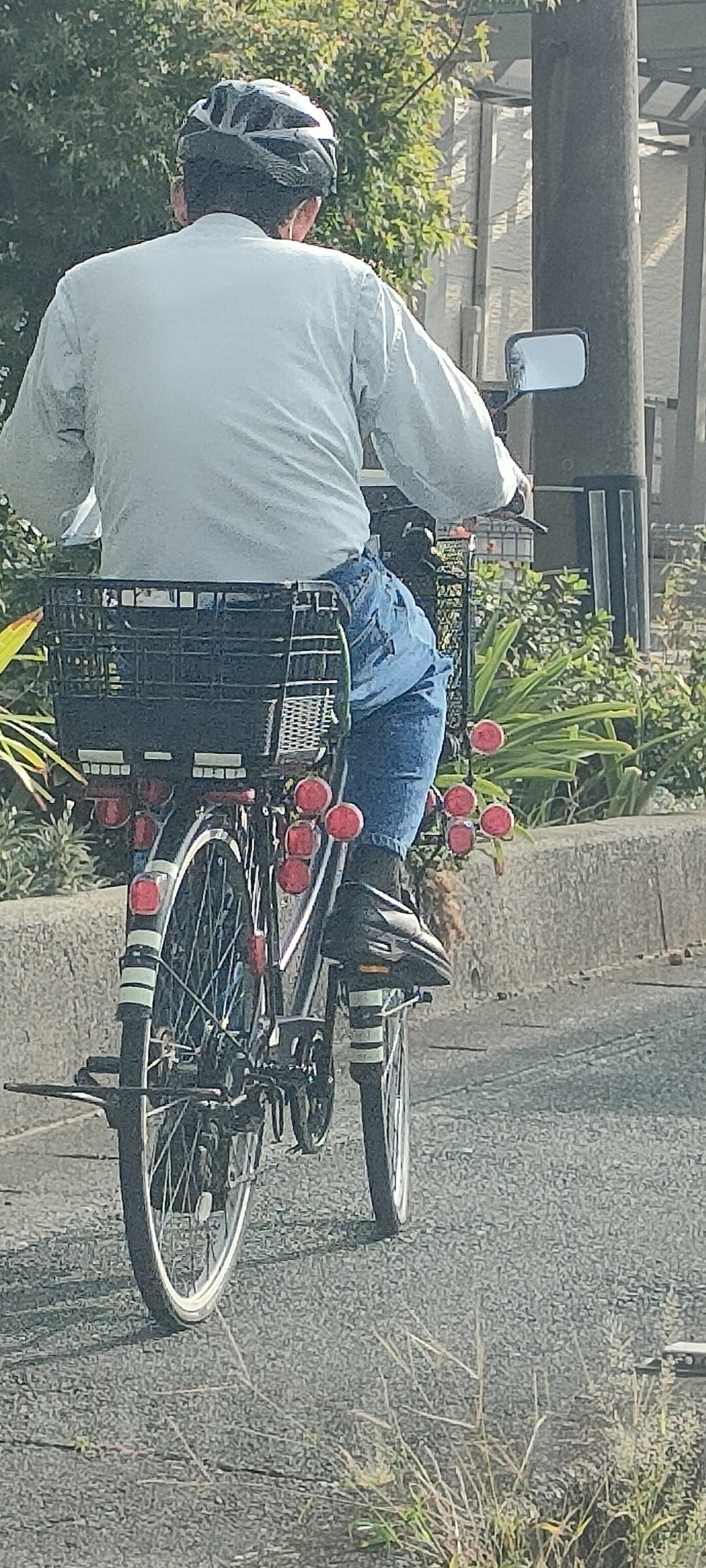 なんと、おじさんのママチャリに反射鏡が約17個もついていたんですよ~(後ろの分だけで)![]()