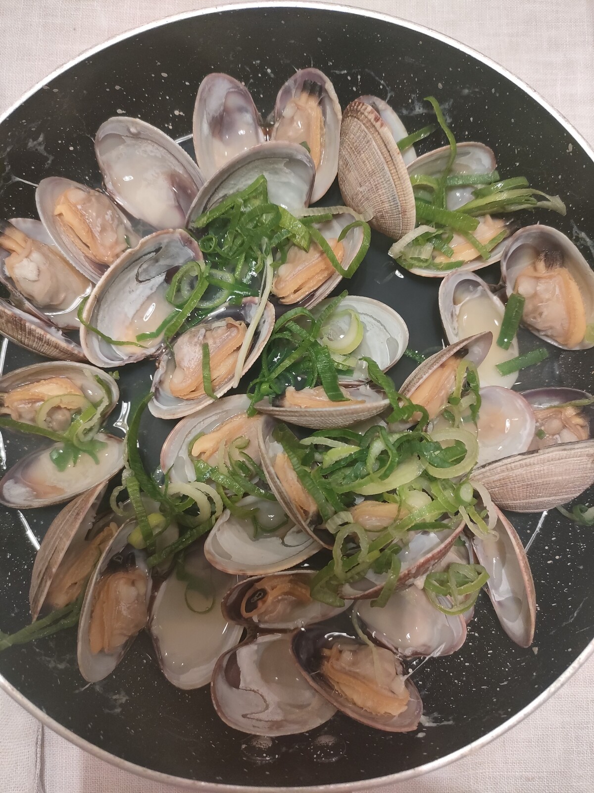 巨大アサリ貝は、素材の味を楽しみたいので、シンプルにお酒だけで酒蒸しにしました。