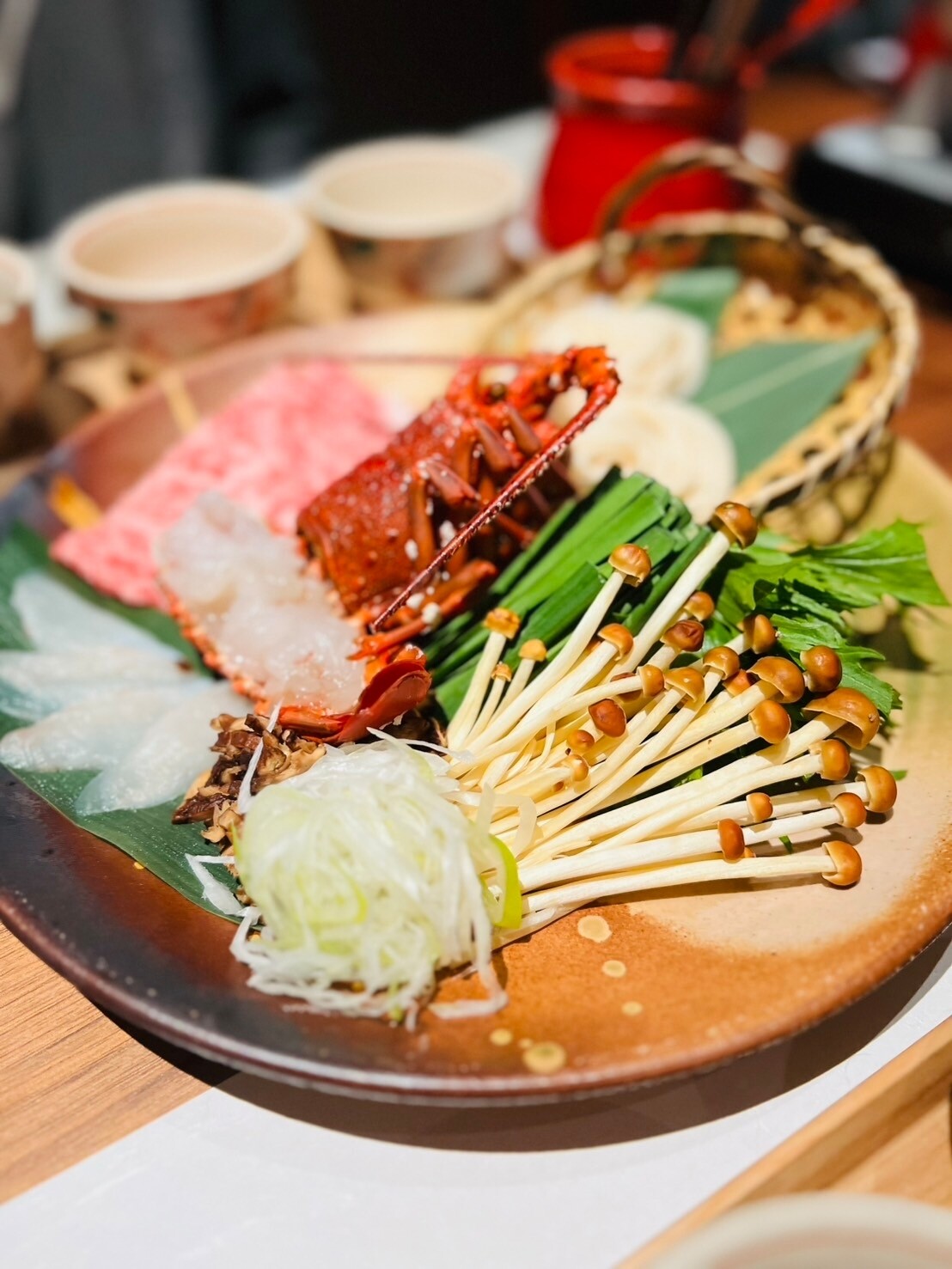 あご出汁しゃぶしゃぶは、お食事をランクアップしたので、伊勢海老とフグ、和牛ロースが盛り合わせできました。