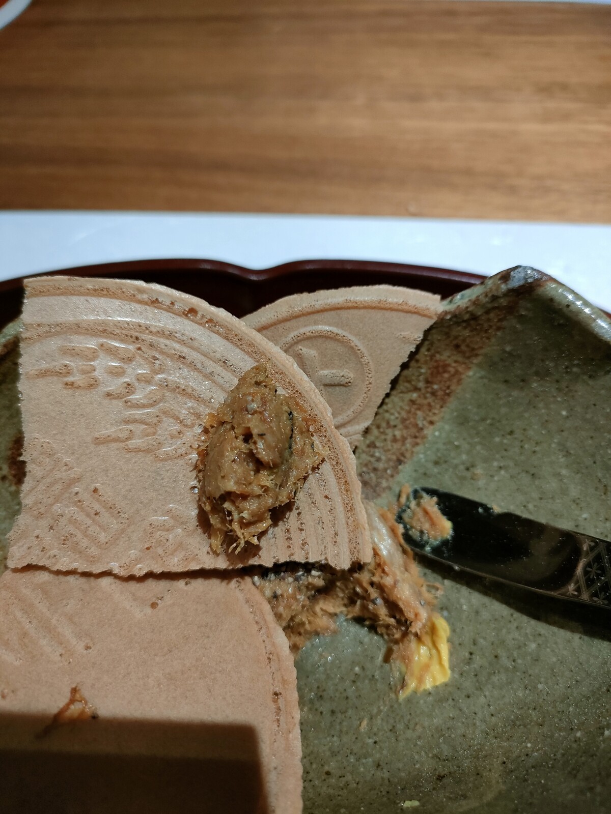 ほのかに甘いパリパリせんぺいに、甘じょっぱいリエットが合うわ~