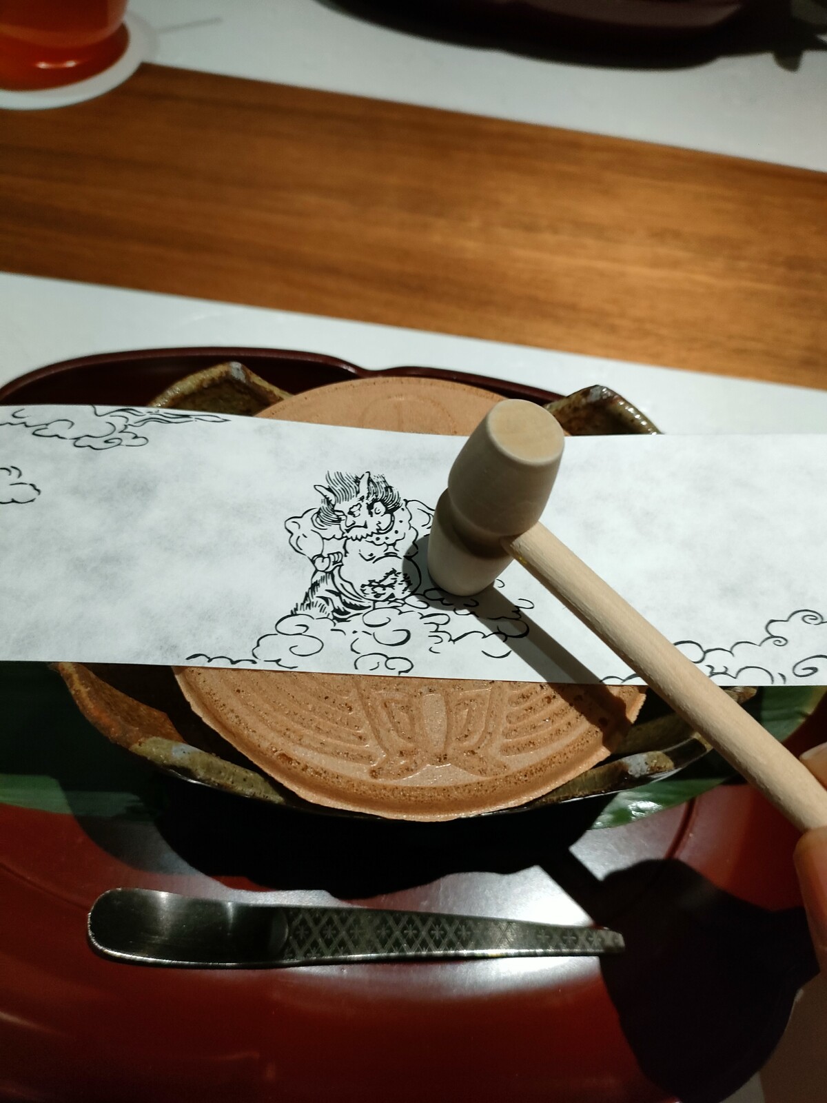 鬼めがけて木槌を打ち、せんぺいを割っていただきますよ~