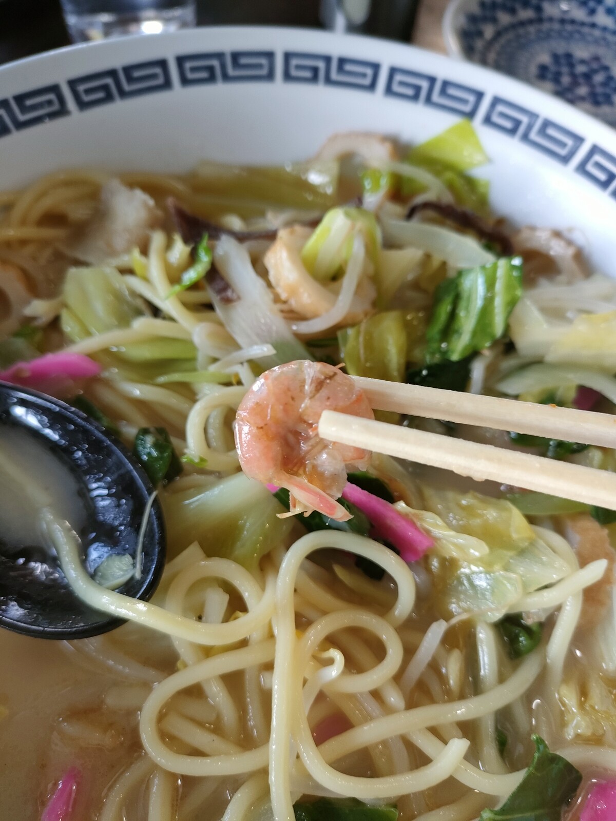 オバマちゃんぽんは、あっさりしたコクのあるスープにもっちりした太麺がよくからみ、エビが殻付きで入ってるのが特徴なんですよ~