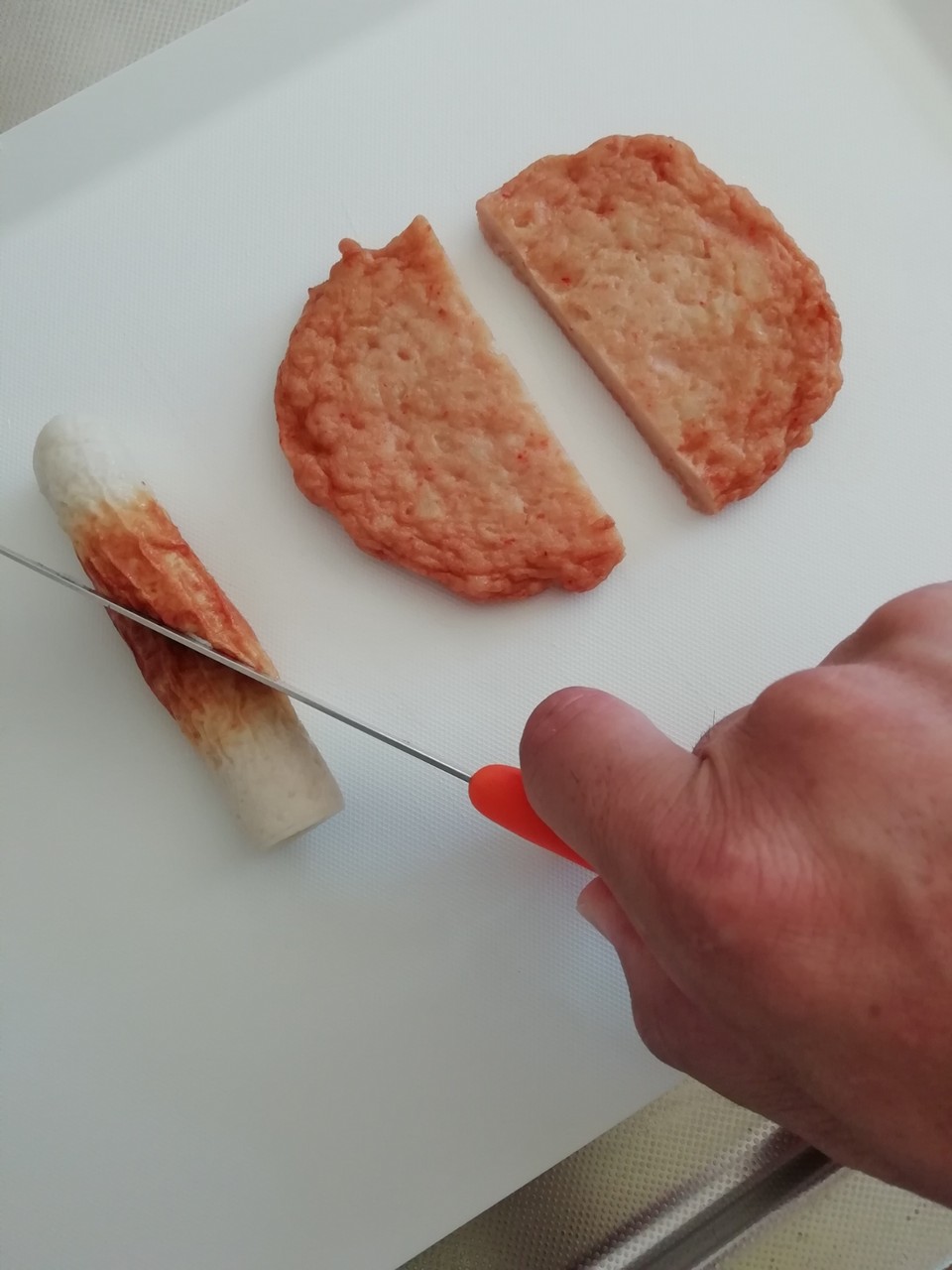 ちくわの穴にチーズをさしこみ斜め半分にカットする