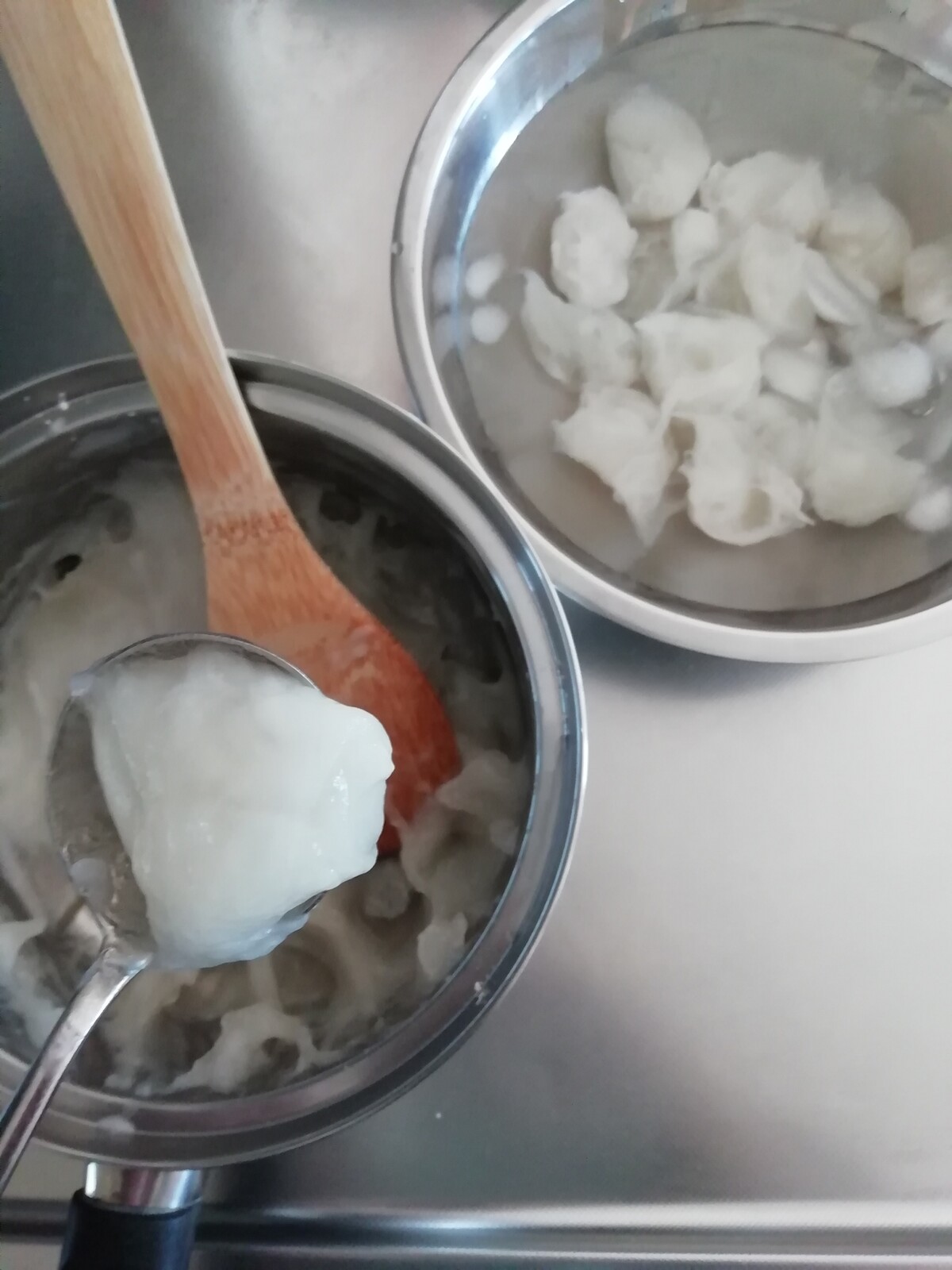 卵を1個ずつ加えて混ぜます。