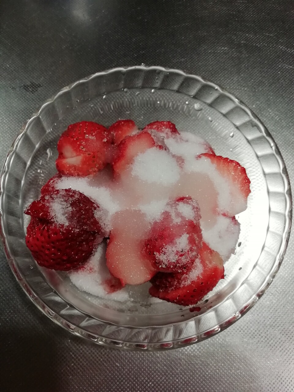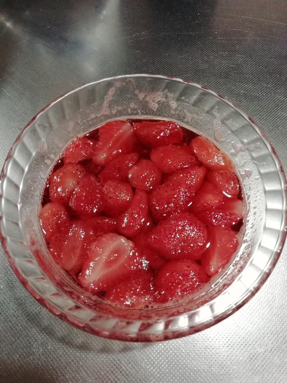 まずはいちごと砂糖、レモン汁を耐熱容器に入れレンジ過熱し、ブレンダーで潰しましたー