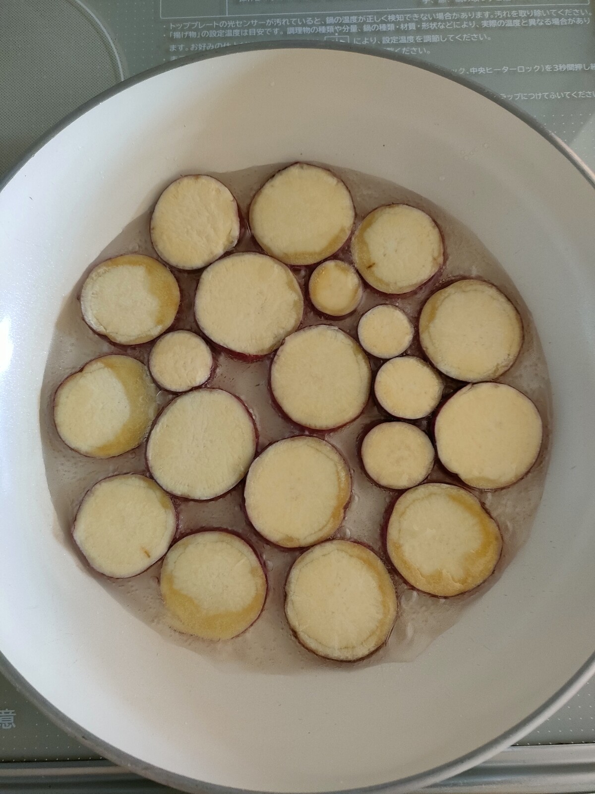 さつま芋は皮付きのままきれいに洗い5ミリ厚の輪切りにし水にさらす