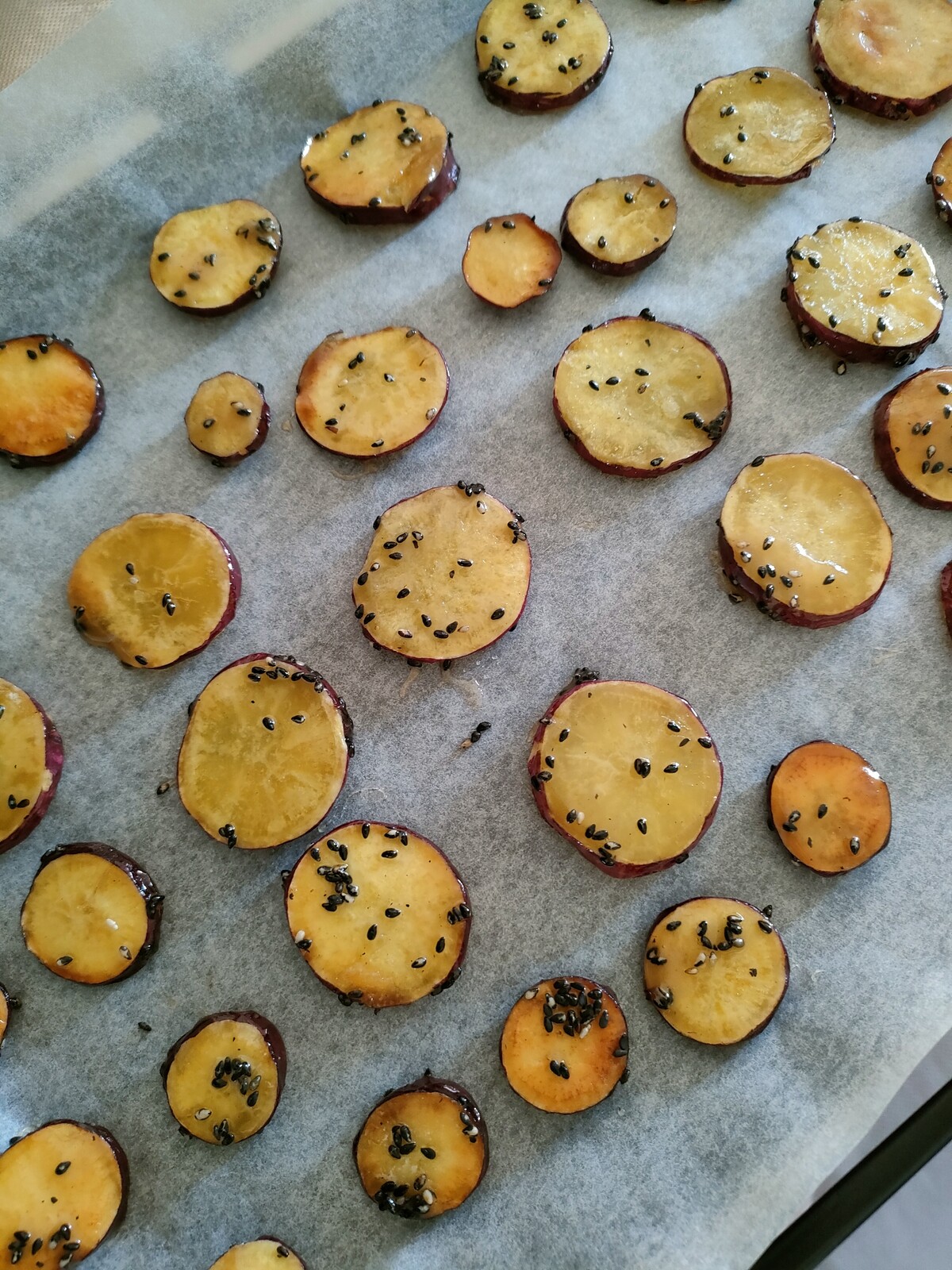 薄くスライスしたさつま芋を大匙3の油で揚げ焼きして~