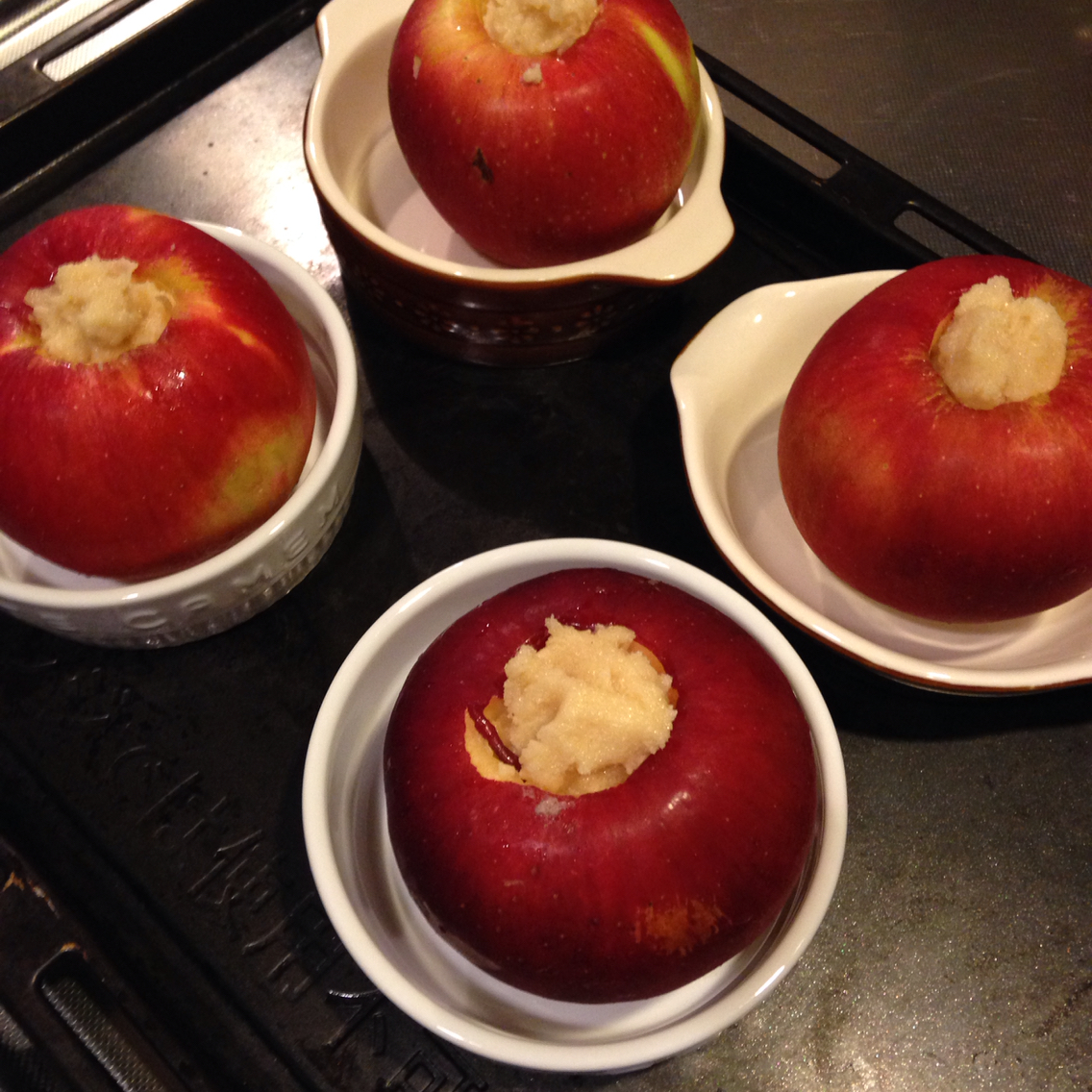 1個ずつ耐熱皿に入れ、くり抜いた所にバターと三温糖、シナモンを混ぜた物を詰めて1時間程焼きました