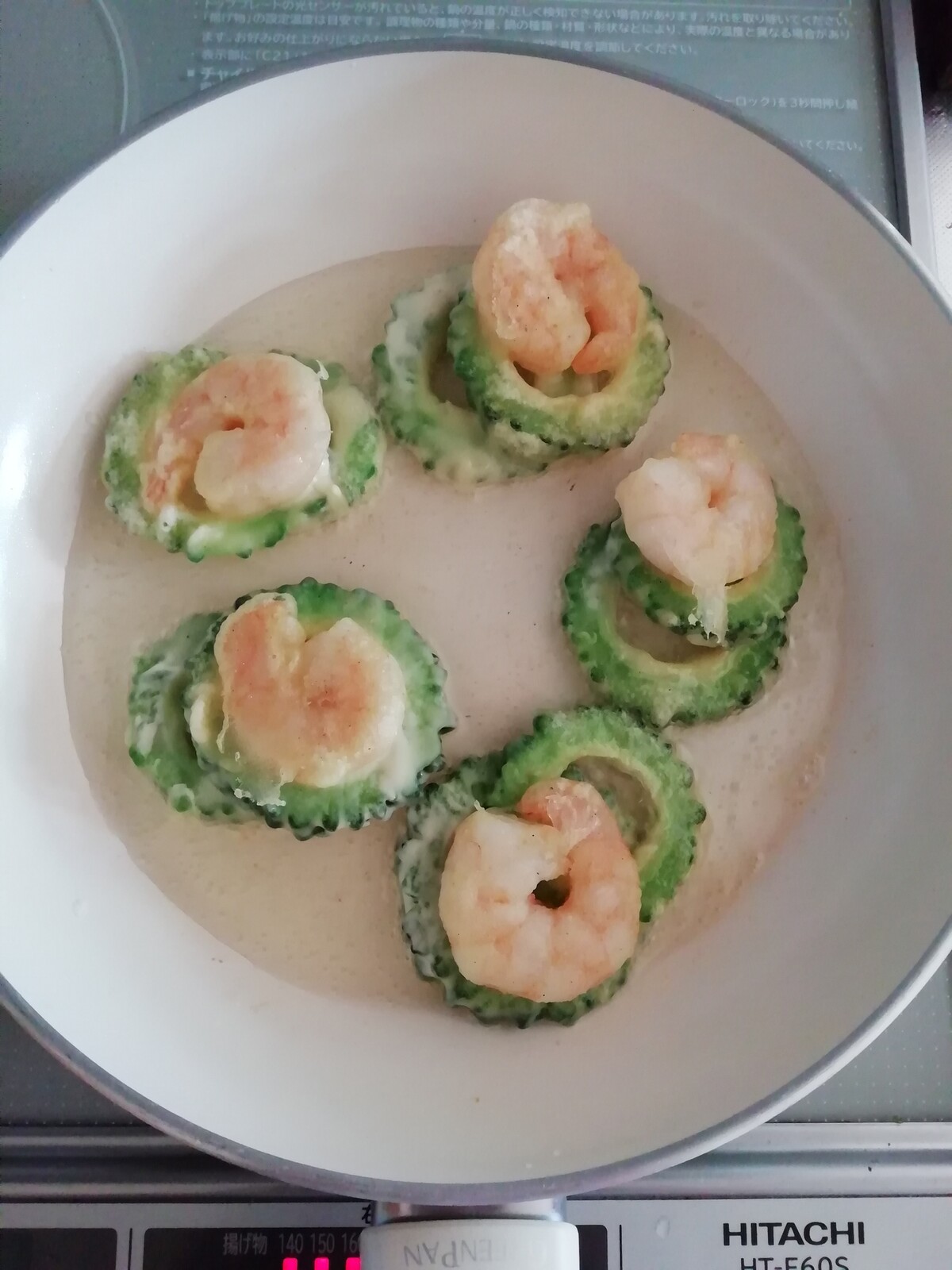 フライパンに油を熱し、ゴーヤ2枚とエビ1個を1組にして衣を付けさっくり揚げる