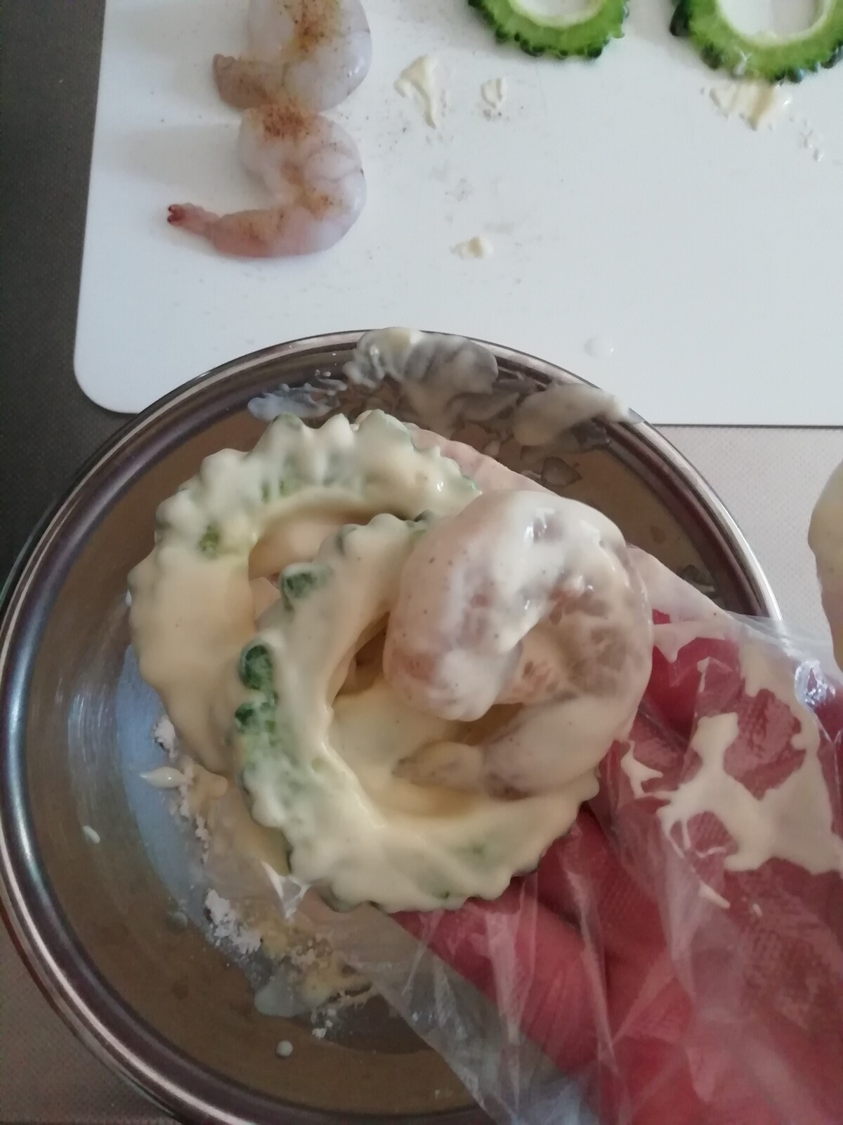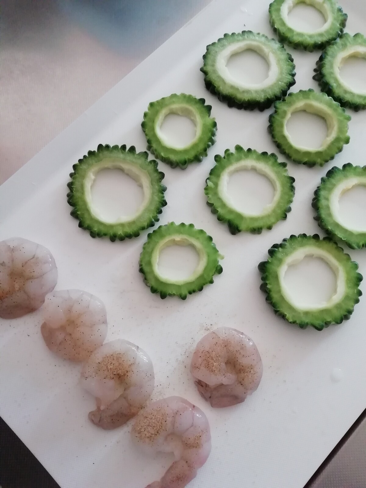 ゴーヤは5ミリの輪切りにして、エビは洗ってキッチンペーパーで水気を取り塩コショウします。