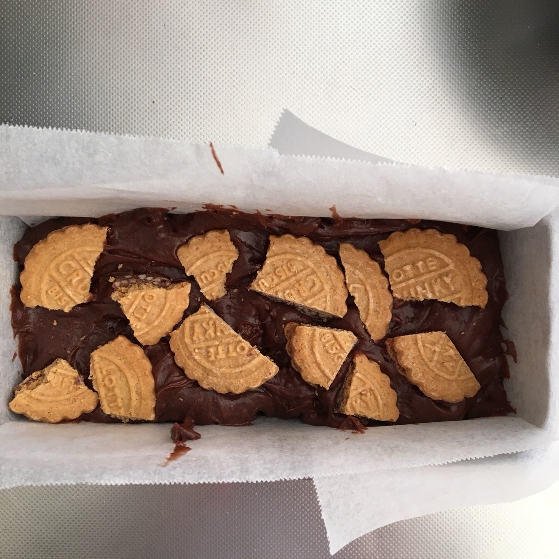 型に生地を流しいれたら、ケーキの上にもバランスよくクランキービスケット2枚を置いて180度で25分焼きます。