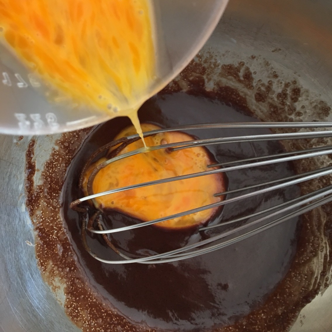 これに砂糖、牛乳、卵、ホットケーキミックス、ココアの順に加えよく混ぜます