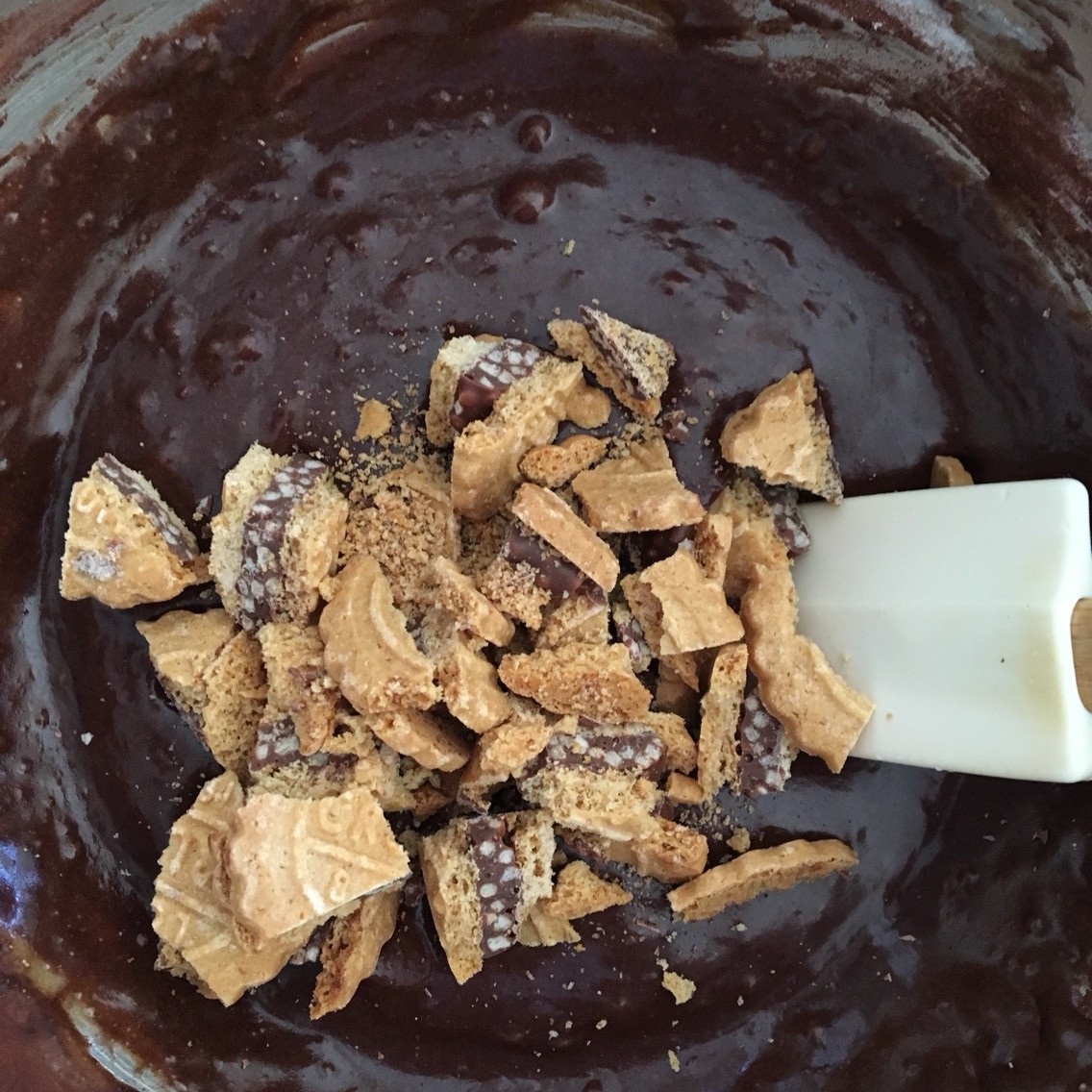 ナイフで砕いたクランキービスケット3枚を加えゴムベラでさっくり混ぜます