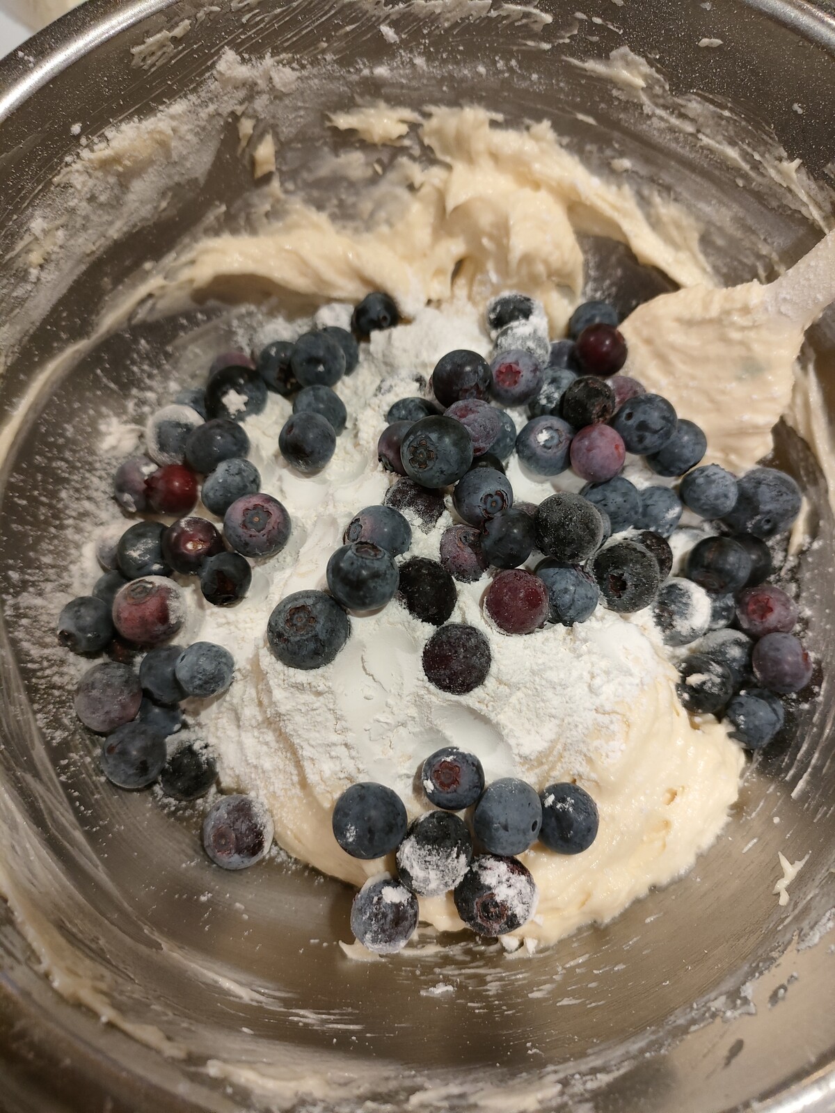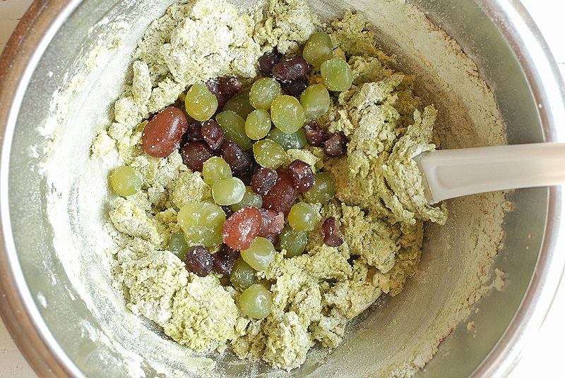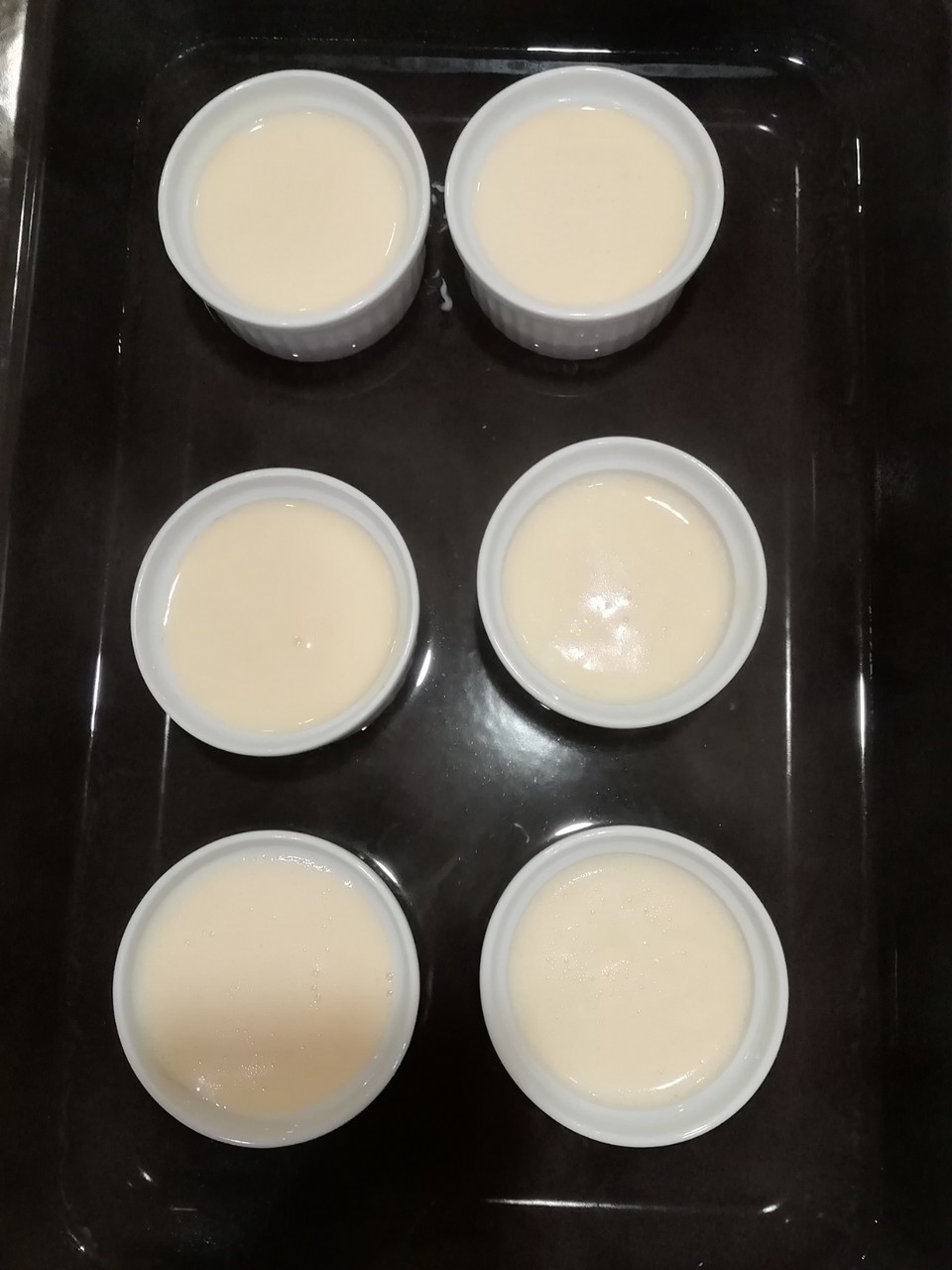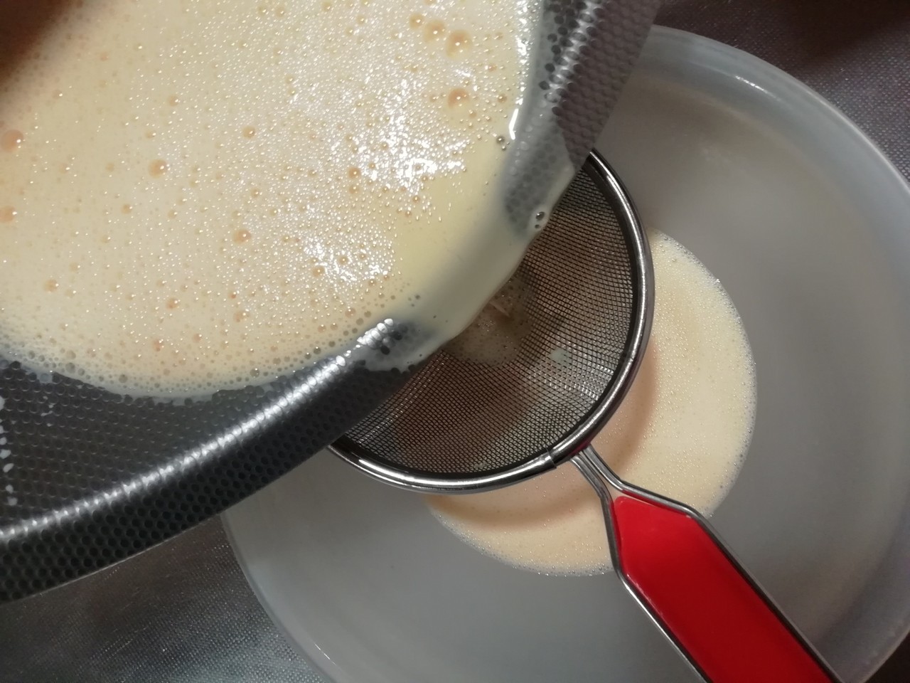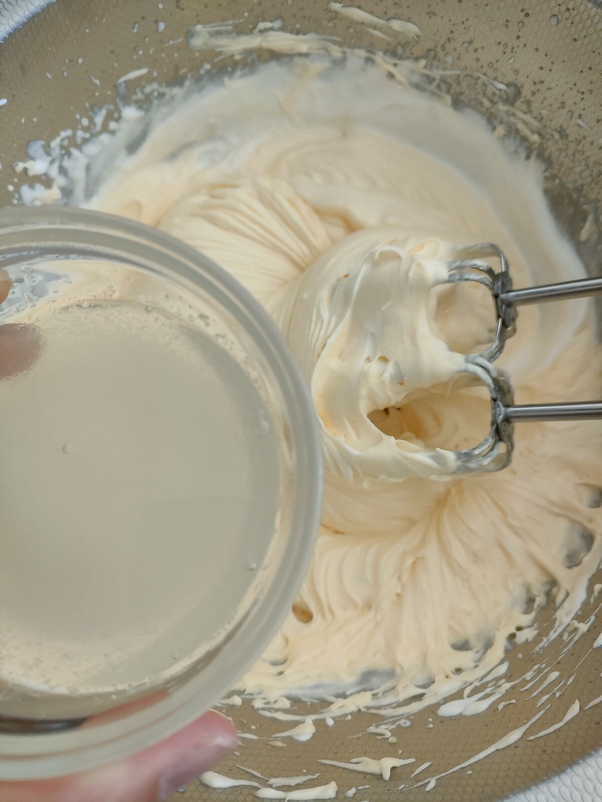 二つの生地を合わせて混ぜたら、湯で溶いたゼラチンを加えてよく混ぜます。