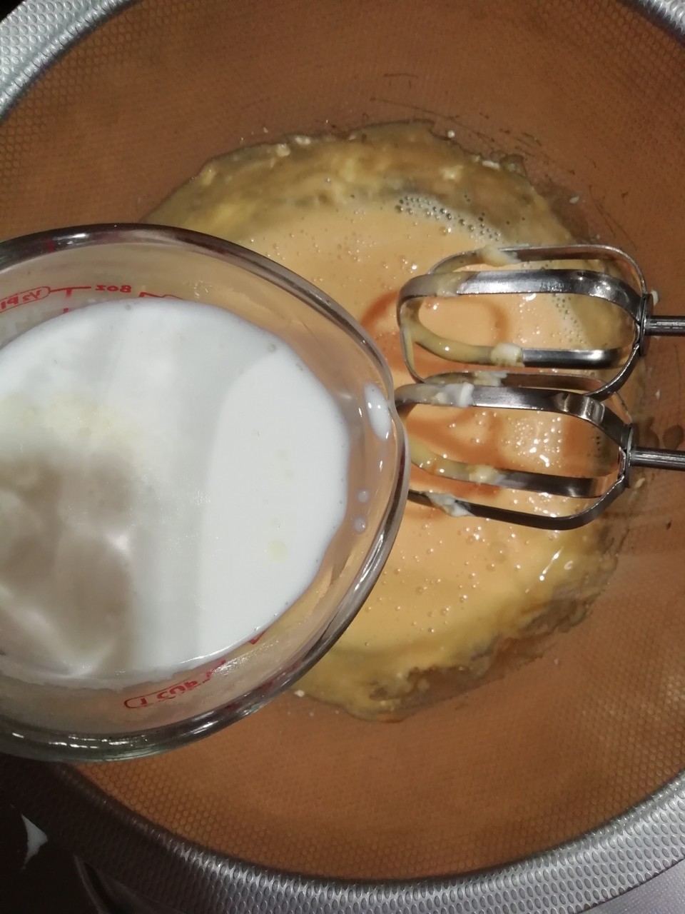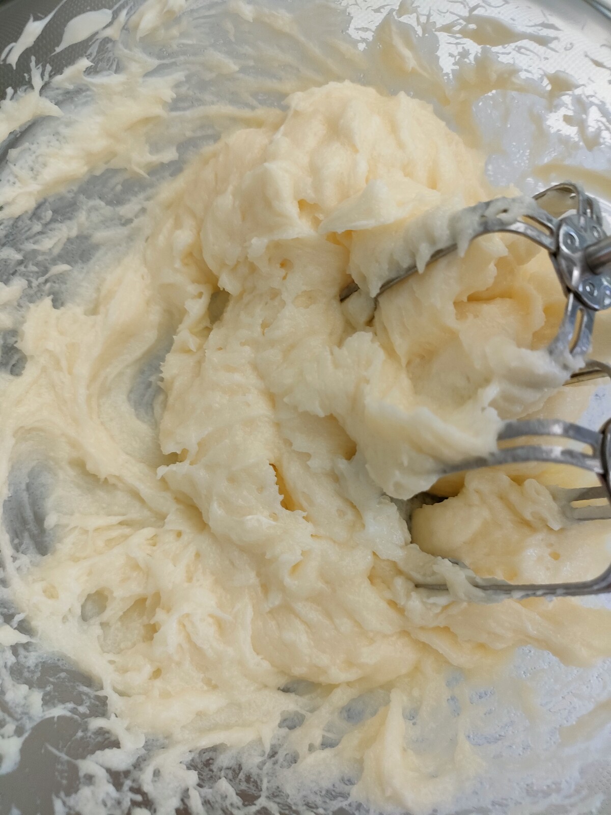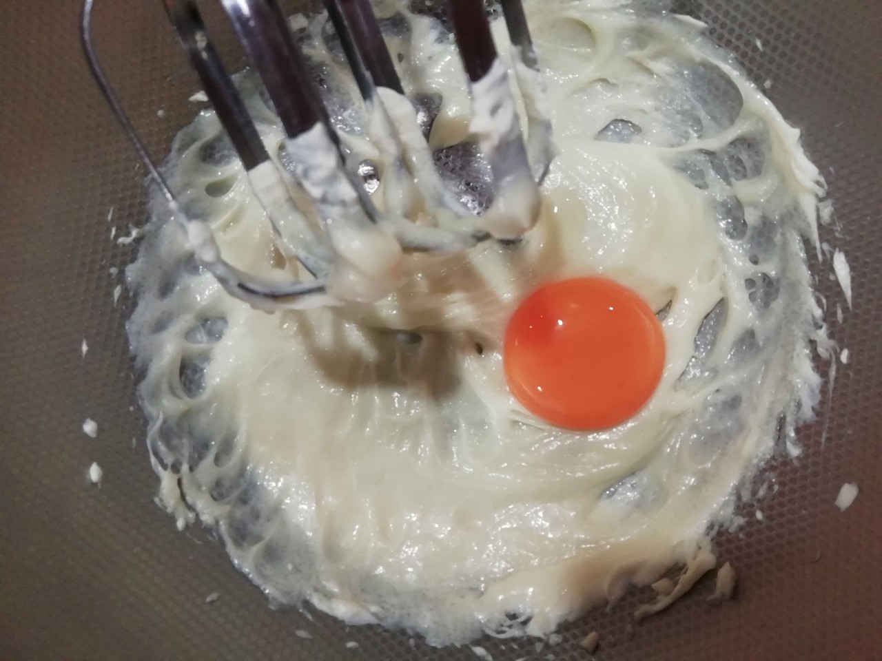 レンチンしたクリームチーズと砂糖、卵黄を混ぜて~