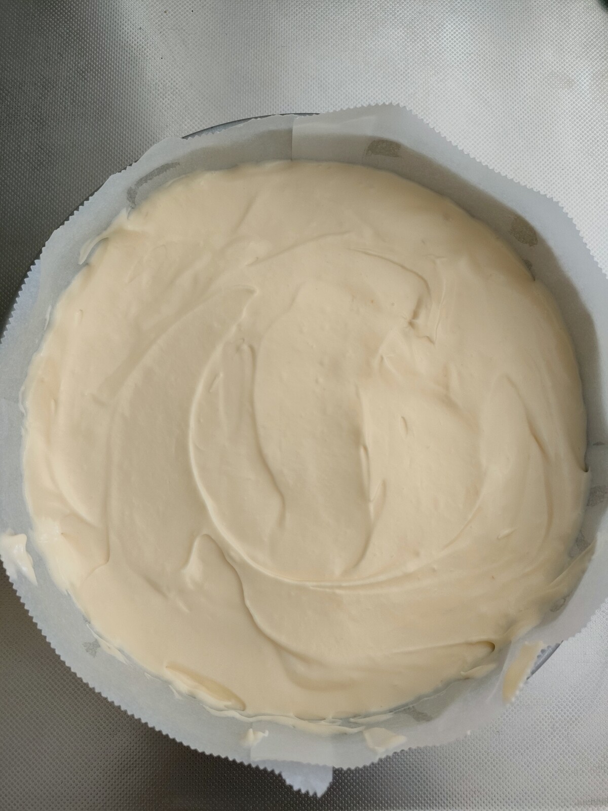 型にチーズ生地を流し込み、ヘラで平らにして冷蔵庫で一晩冷やしたら、仕上げにココアパウダーを振って完成です。