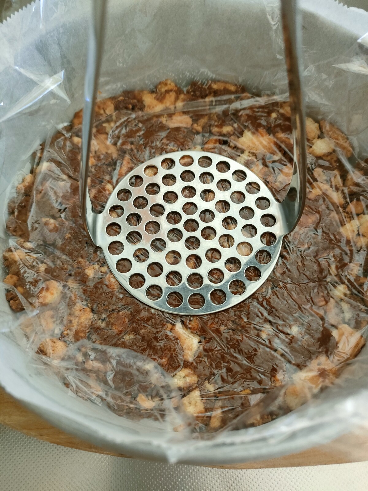 マッシャーを使ってラップの上からクッキーを型に押し付けるとしっかりした土台になります。