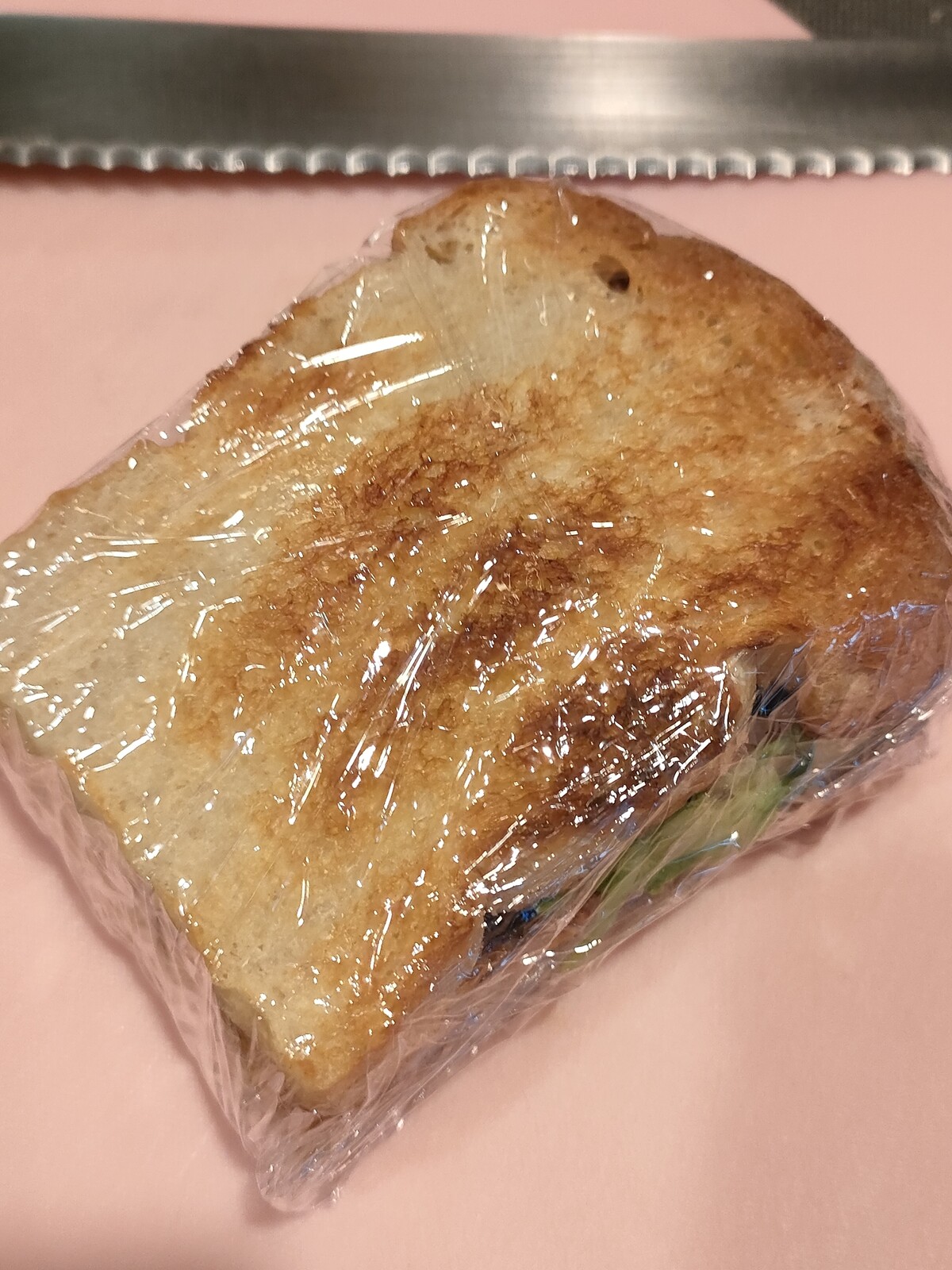 ラップでぐるぐる巻きにして、ブレッドナイフで半分にカットー🔪