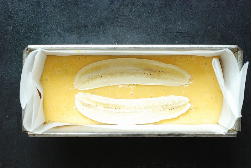 オーブンシートを敷きこんだ型に生地を流しいれ、上にバナナとチョコをトッピングする