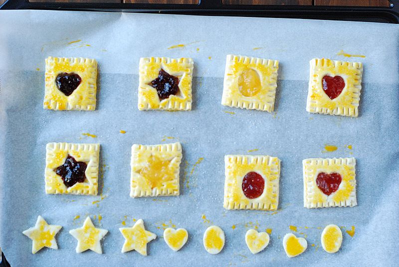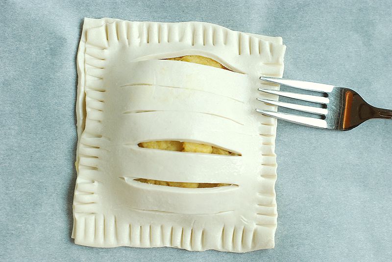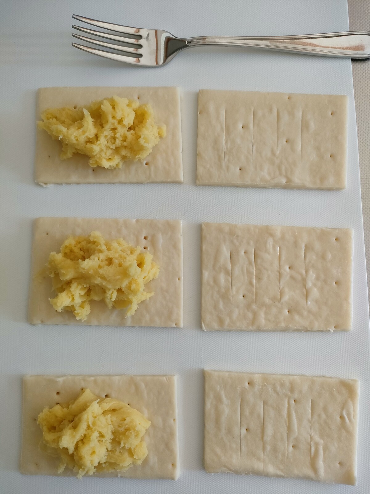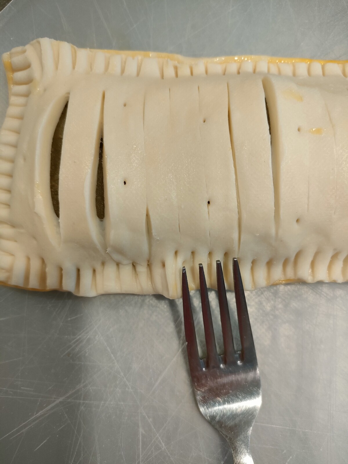 下のシートにさつま芋ペーストを半量のせ、上から切り込みを入れたパイシートをのせ、周りをフォークで押さえながら閉じる。