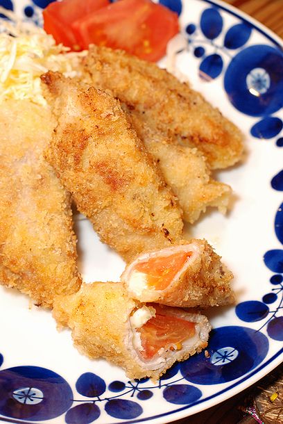 豚薄切り肉でトマトとスライスチーズを巻きパン粉を付けて揚げました。