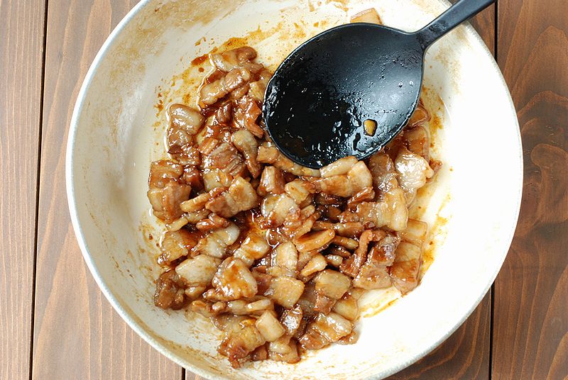 巻き終わりを下にして、フライパンで焼き、前面に焼き色がついたら、酒大匙1、醤油大匙1 1/2、みりん大さじ1 1/2 、砂糖小さじ2を加えお肉を転がしながらタレを絡めたら完成