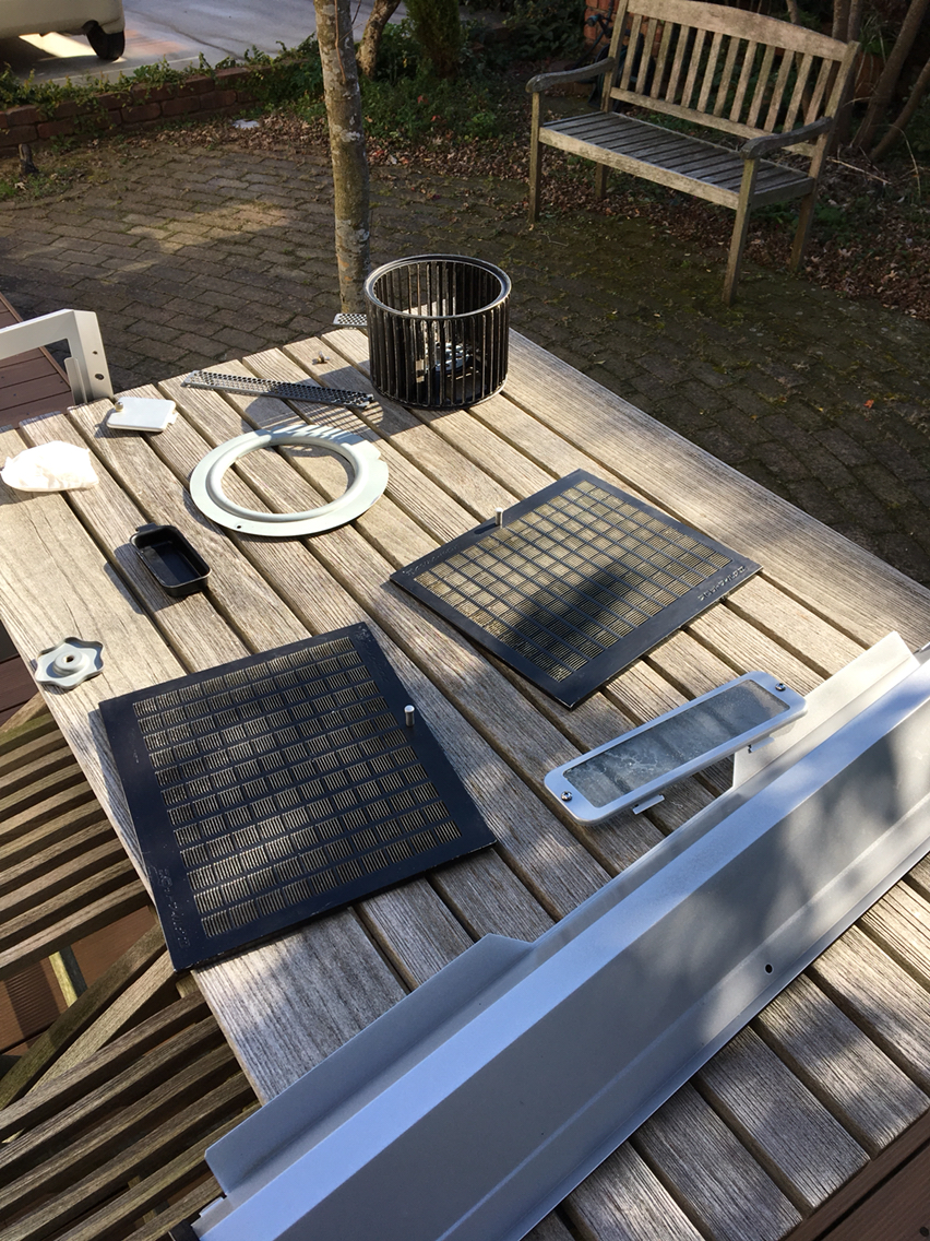 50度位のお湯5Lにセスキソーダ大匙3を溶かした物に羽やねじ関係を30分つけ、洗い流しました。