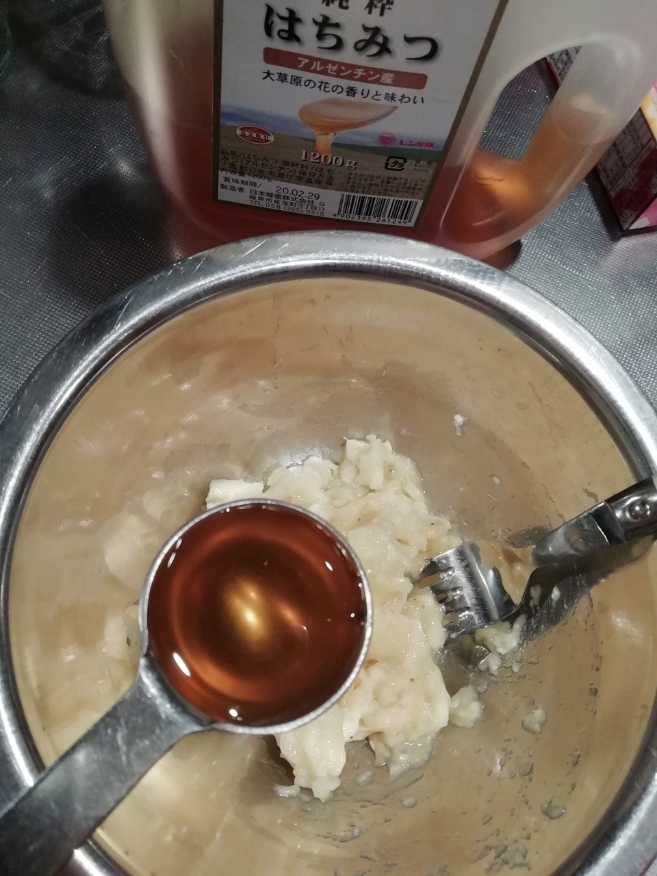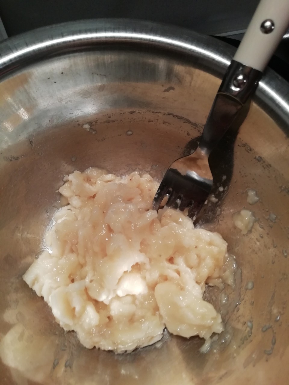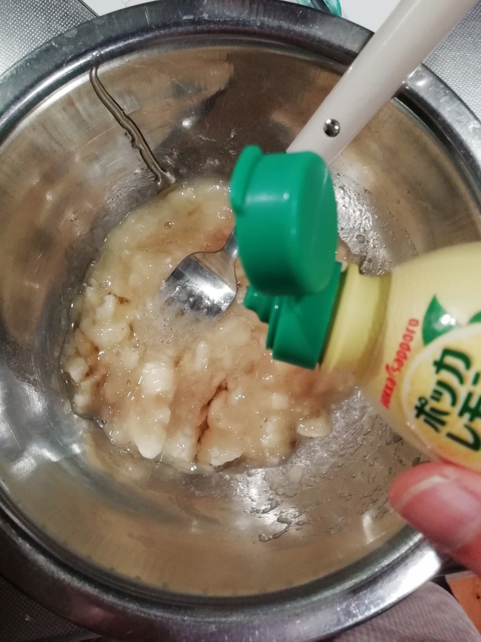 お餅のボウルに卵黄を入れて混ぜて~