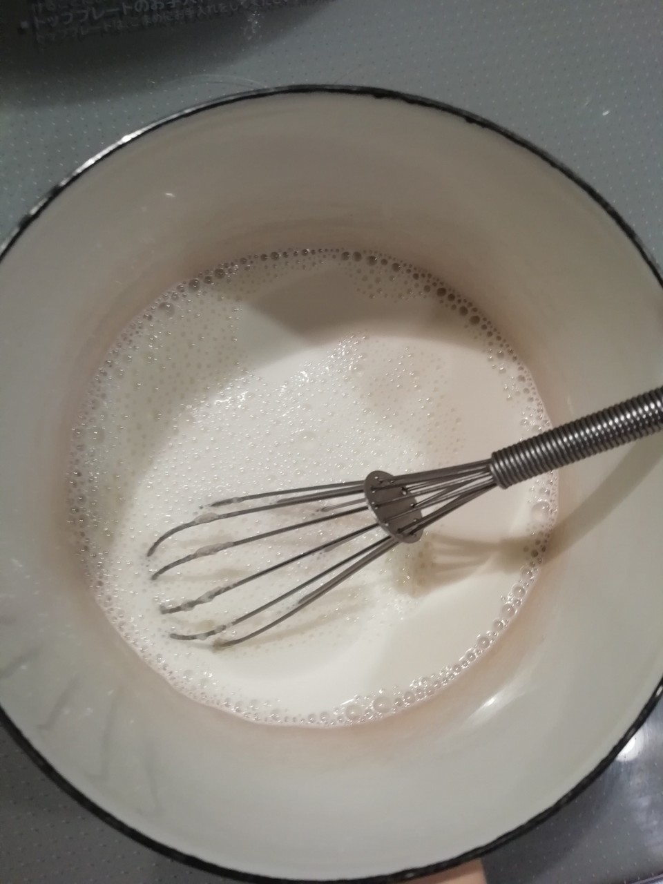 深めの耐熱ボウルに牛乳と角切りにした丸餅を入れ、レンジ600wで5分加熱する。泡立て器でよく混ぜ餅を完全に溶かす。