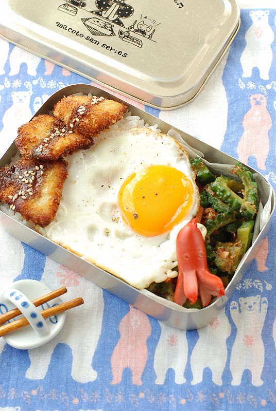 今朝もやっぱり、あるものでいいや~と冷蔵庫を見渡し、大量にあるゴーヤや定番の卵、冷凍のイカフライなど目に付いた物をいくつか取り出し適当に調理しました