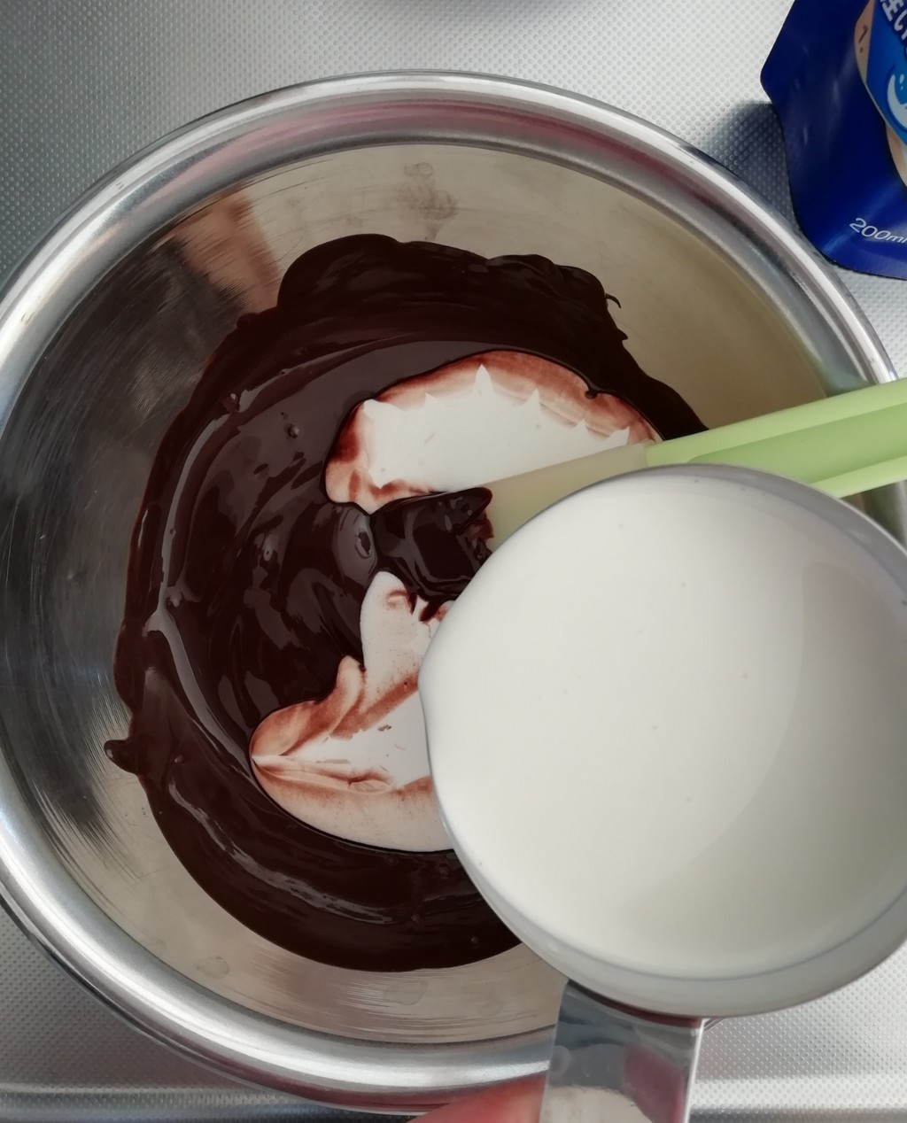 チョコが完全に溶けたらボウルを湯煎から外し生クリームを加えよく混ぜる
