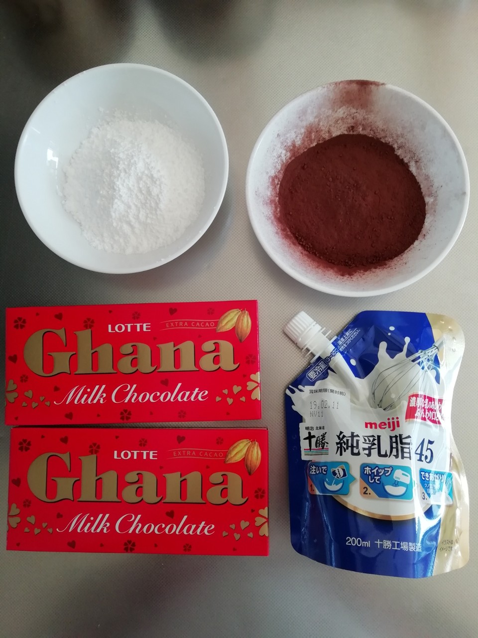 板チョコ2枚、生クリーム、粉糖、ココアパウダー。